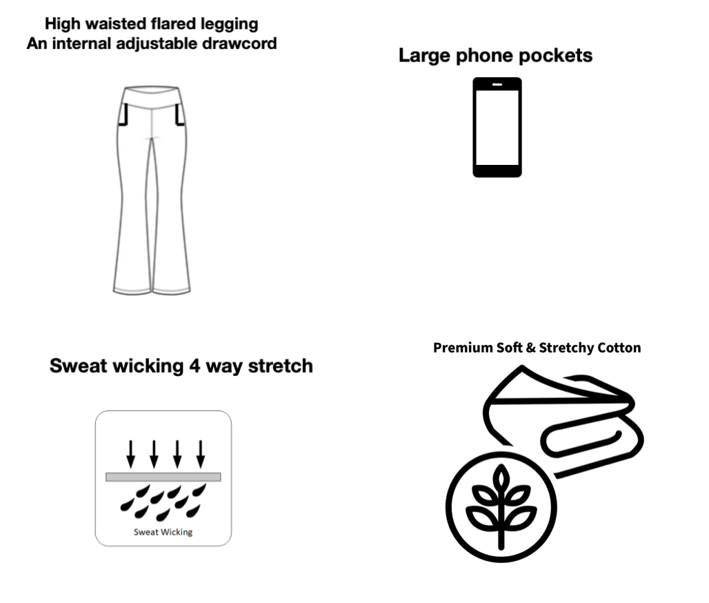 - Game-changing flared leggings with large pockets designed to fit all phone sizes and everyday essentials.